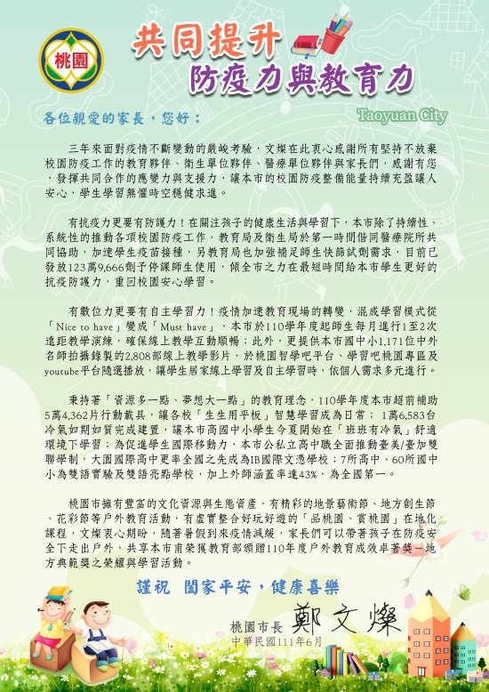 有關本市110學年度暑假「市長給全市高國中小學生家長的一封信」一案。