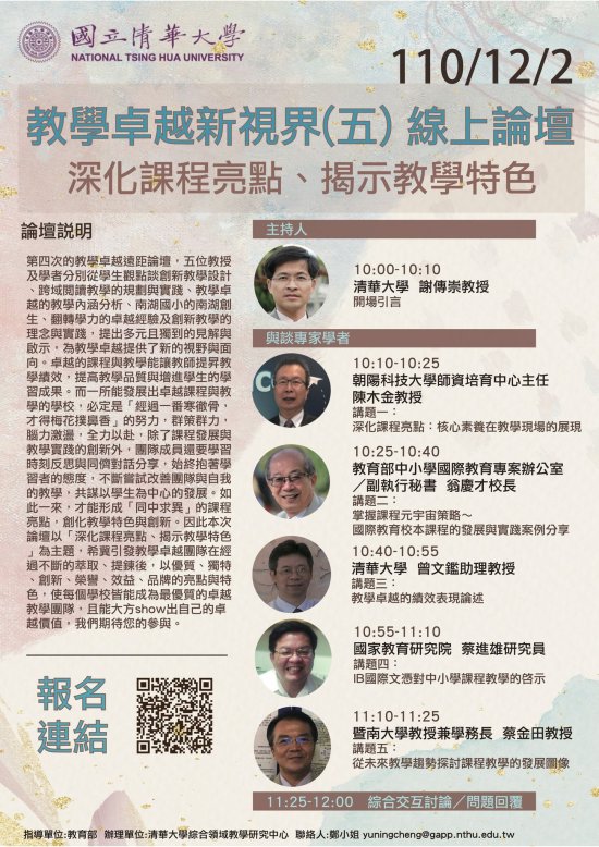 轉知國立清華大學辦理「教學卓越的新視界(五):深化課程亮點、揭示教學特色」線上論壇