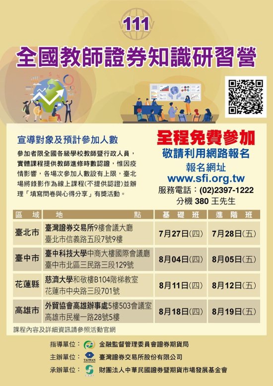 | 三、 | 旨揭活動各場次自即日起至111年8月19日,全程免費參加,參與教師可獲得教師研習時數,詳情請至該基金會網站「全國教師證券知識研習營」專區查詢( 網址為https://webline.sfi.org.tw/workshop/Default.asp?csn=578),洽詢電話02-23971222分機380王先生。 |