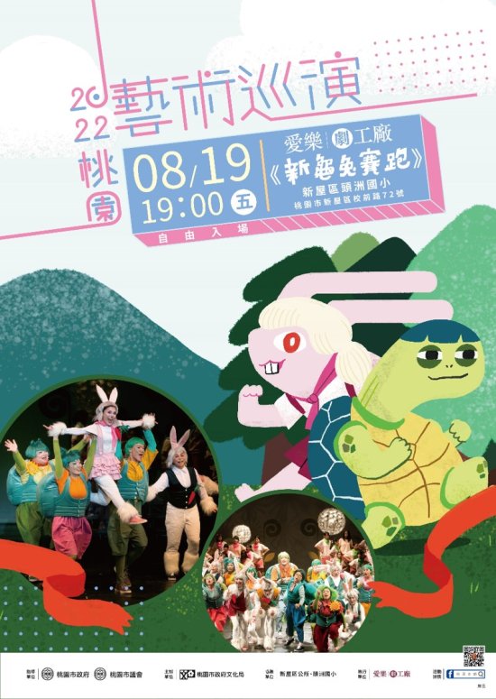 111年8月19日(星期五)晚間7點歡迎來新屋區頭洲國小操場欣賞由「愛樂劇工廠」演出的兒童歌舞劇《新龜兔賽跑》,一同共享歡樂戲劇夜!