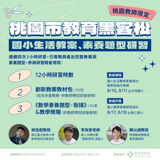 1、 研習對象:桃園市國小教師(年級、科目不限,暑假後為高年級數學授課優先)。
