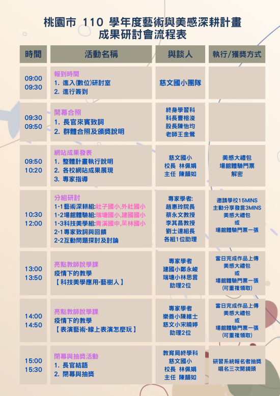 | (四) | 報名方式:自即日起至111年8月19日(星期五)止請至本市教育發展資源入口網登錄報名(辦理單位:慈文國小,活動編號:E00017-220700001),並覈實核發研習時數6小時。 |
