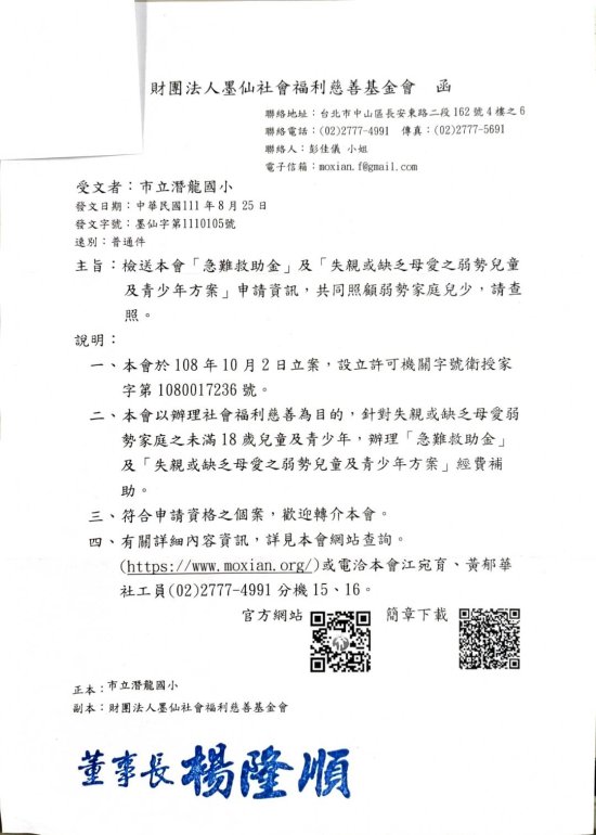 轉知 墨仙社會福利慈善基金會「急難救助金」及「失親或缺乏母愛之弱勢兒童及青少年方案」申請, 詳見附件檔內文(網站說明,或電洽該會社工員)。