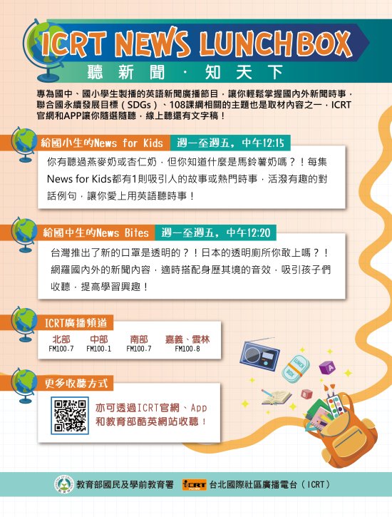 | 二、 | 國教署致力於推動英語學習走出教室與課本的框架,與日常生活中英語實際使用情境做銜接,期盼國中小學學生能增加國際視野及具多元文化的專業知能。利用廣播新聞的即時性,提升學生對時事的關注度,增加學生與國際接軌的機會,爰委託財團法人台北國際社區廣播電臺(以下稱ICRT)於111學年度辦理「製播英語廣播互動學習計畫」。 |