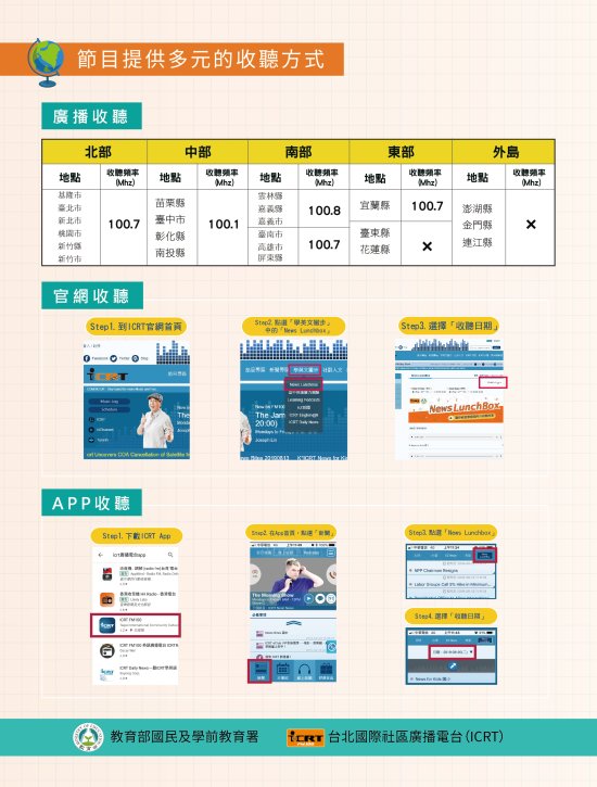 | (一) | 製播新聞英語學習廣播節目ICRT News LunchBox:係就國內外重大新聞及時事議題,製播國中、小英語學習廣播節目,於上課日午餐時間播出(國小12時15分至12時20分、國中12時20分至12時28分),透過ICRT官網(https://www.icrt.com.tw/)及教育部酷英Cool English英語線上學習平臺(http://www.coolenglish.edu.tw/)即時播出。 |