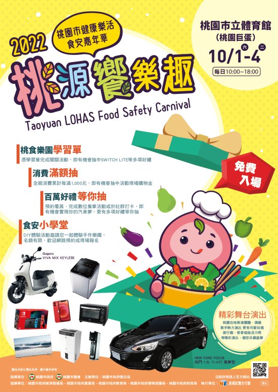 活動於111年10月1日(六)~10月4日(二)上午10:00至18:00假桃園市立體育館(地址: 桃園市桃園區三民路一段1號)辦理111年度桃園市「健康樂活食安嘉年華」活動。