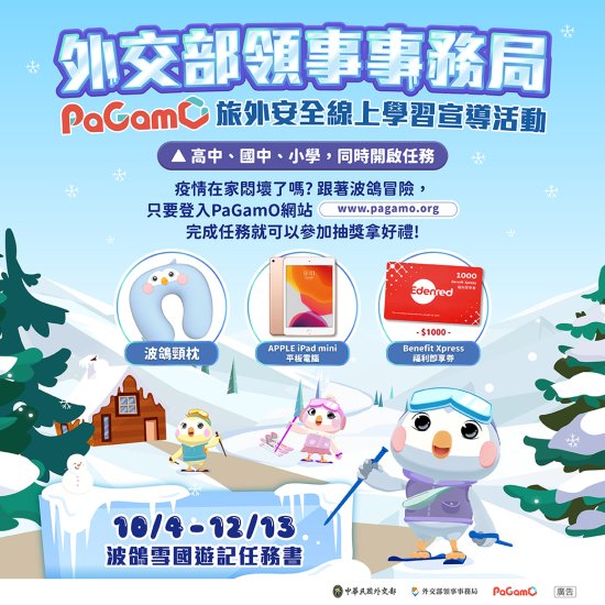 二、為維護國人權益、及早將旅外安全正確觀念向下札根,外交部領事事務局委託PaGamO線上教育平台,針對中、小學生於本(111)年10月4日至12月13日配合「波鴿雪國遊記」影片,舉行旅外安全線上學習宣導活動。