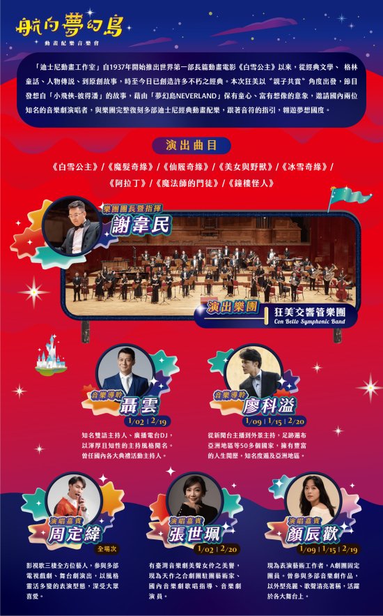 「迪士尼動畫工作室」自1937年開始推出世界第一部長篇動畫電影《白雪公主》以來,從經典文學、格林童話、人物傳說、到原創故事,時至今日已創造許多不朽之經典。「航向夢幻島」節目以〝親子共賞〞角度出發,節目發想自「小飛俠-彼得潘」的故事,藉由「夢幻島Neverland」保有童心、富有想像的意象,邀請國內兩位知名的音樂劇演唱者,與樂團完整復刻多部迪士尼經典動畫配樂,跟著音符的指引,翱遊夢想國度。