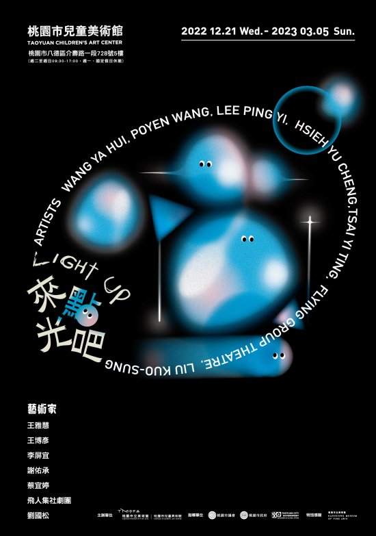 一、桃園市兒童美術館策劃「來點光吧」年度特展,展出王雅慧、王博彥、李屏宜、謝佑承、蔡宜婷、飛人集社劇團、劉國松等七組藝術家/團隊的作品,透過錄像、繪畫、互動裝置、劇場等不同當代藝術創作,捕捉光的不同形象與姿態,引導孩童開啟一場以光為主題的思考與漫遊。