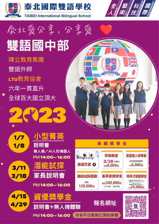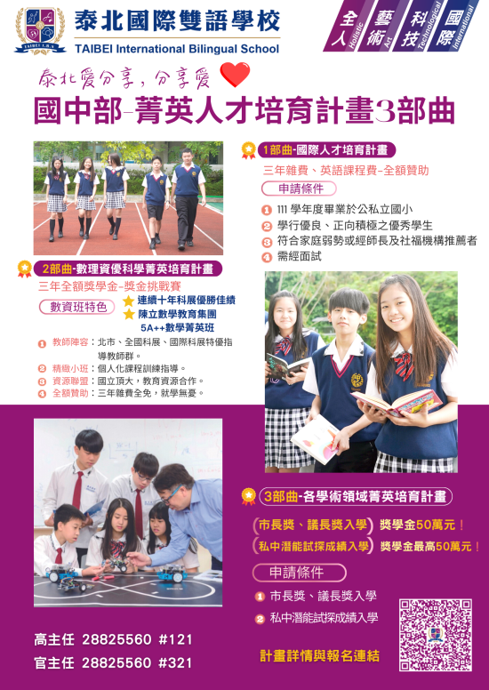 | 七、 | 學習環境:本校雙語國中部,符應2030年雙語國家政策,業於2022年通過ISA國際學校獎中級認證,每週8節外師授課,與美國、加拿大、英國、日本簽訂雙聯學制等,致力培育國際人才。可申請住宿,亦歡迎外縣市學子報名。 |