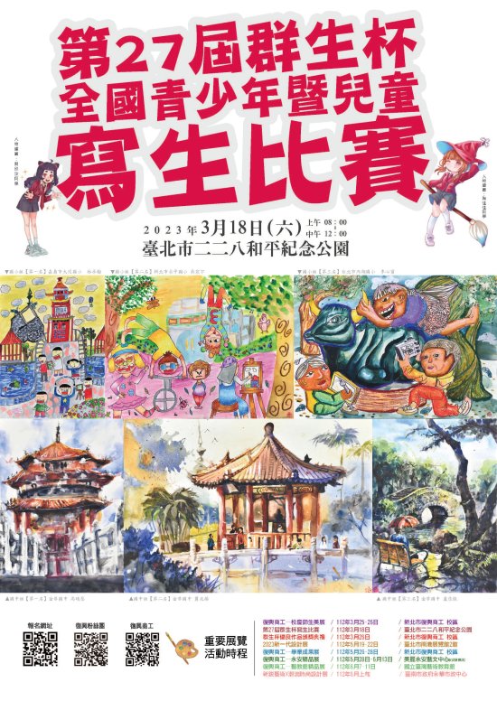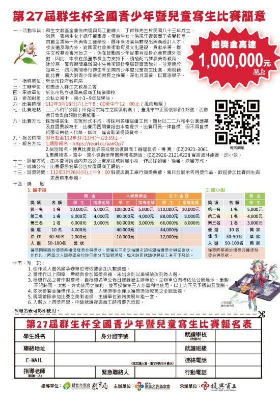 主旨:檢送本校承辦財團法人群生文教基金會「第27屆群生杯全國青少年暨兒童寫生比賽」簡章,敬請 惠予宣導,鼓勵學生踴躍參加,請查照。