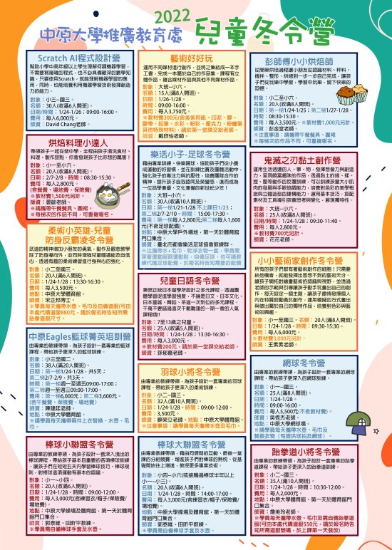 旨:檢送本校推廣教育處開設「兒童冬令營」系列課程簡章1份,請查照並惠予公告。