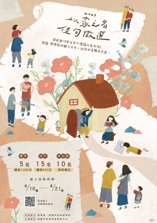 | (三) | 徵選主題:以「家人」、「關係」、「幸福」、「愛」、「學習」、「經營」或「多元家庭」等舉凡與家庭相關之佳句;內容不超過20字,每人限投稿3句。 |