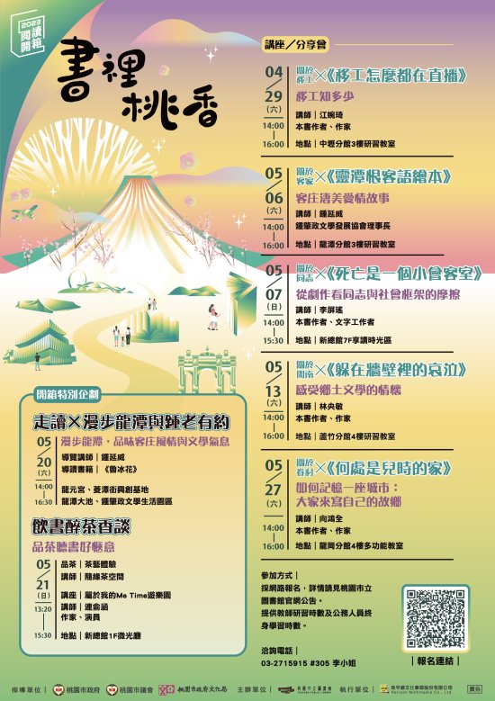 | 二、 | 「2023桃園閱讀開箱:書裡桃香第一季活動」於112年4月29日至5月27日辦理,場次如下: |