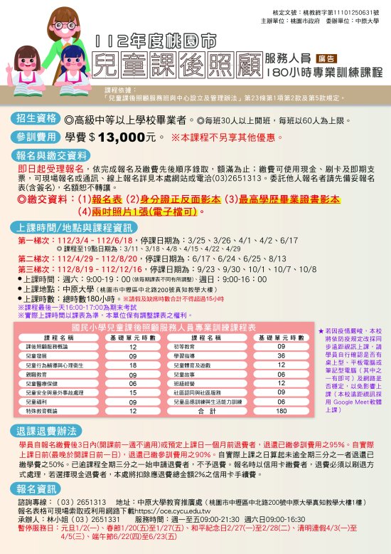 轉知中原大學辦理「桃園市112年度兒童課後照顧服務人員180小時專業訓練課程」簡章及報名表各1份