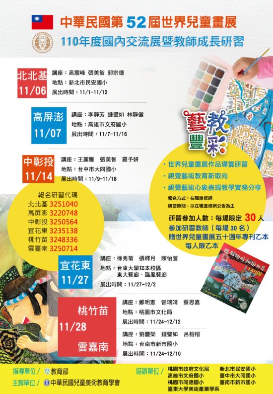 | 主旨: | 有關中華民國兒童美術教育學會辦理「110年世界兒童畫展國內交流展暨教師進修研習」活動一案,請查照。 |