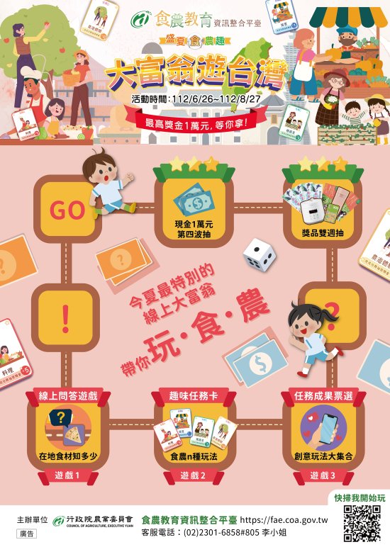 | 為推播應用「臺灣農產地圖」單元內容,該會近期將舉辦「盛夏食農趣:大富翁遊臺灣」活動(網址:https://fae.coa.gov.tw/2023event/),總獎金超過10萬元,歡迎大家踴躍參加。 |