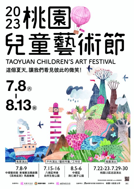 一、本局為推廣兒童藝術啟蒙與在地藝文紮根,規劃辦理「2023桃園兒童藝術節」活動,活動內容包含劇場售票親子節目、戶外親子演出及兒童市集活動、13區推廣演出、在地藝文好戲等,於112年7月8日至8月13日於桃園多區辦理。