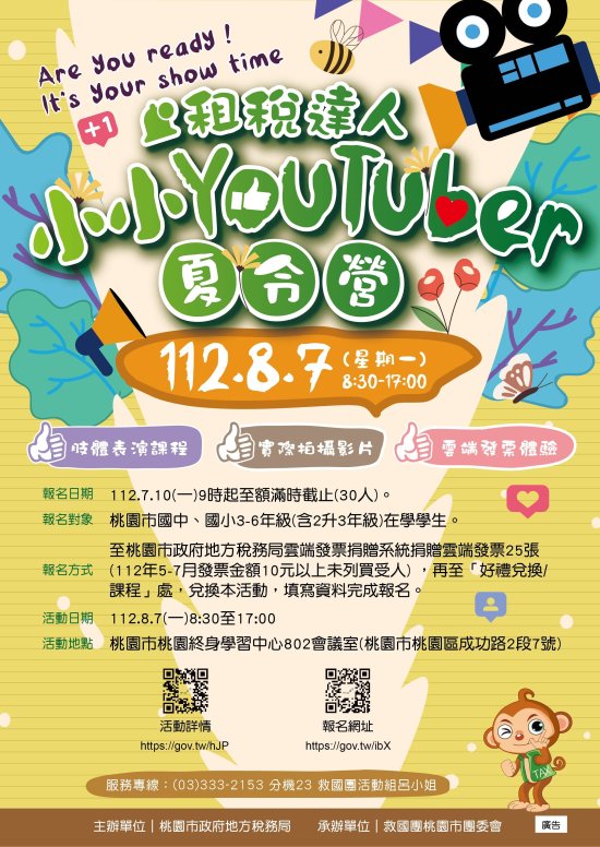 主旨:檢送桃園市政府地方稅務局112年「租稅達人小小YouTuber夏令營」活動海報及辦法各1份,請貴校鼓勵學生踴躍報名參加,請查照。