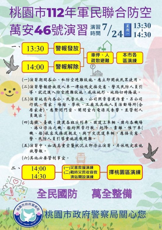 112年軍民聯合防空(萬安46號)演習北部地區,將於7月24日13時30分至14時,實施疏散避難演練有交通管制,屆時請市民配合演習演練,若未配合將依《民防法》第25條規定,裁處3萬元以上、15萬元以下的罰鍰。