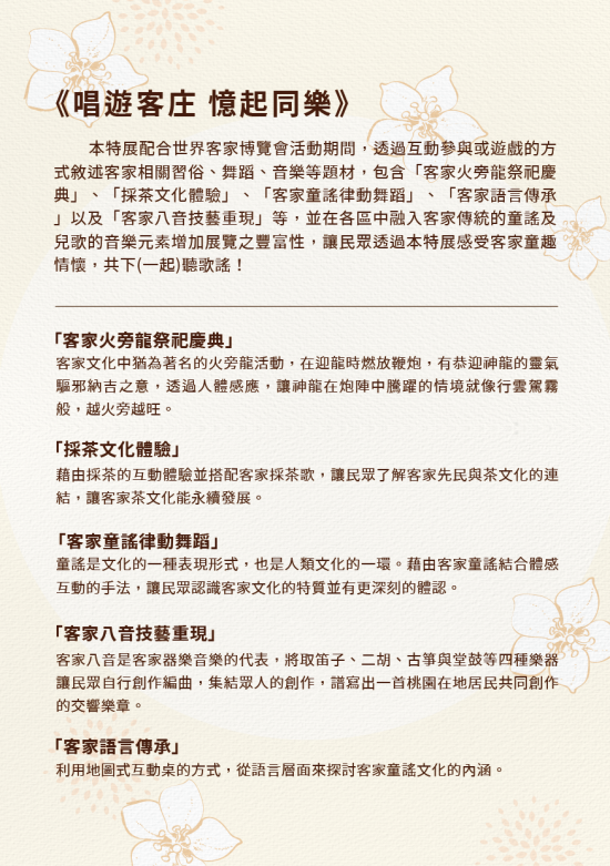 二、本檔特展配合世界客家博覽會活動期間,透過互動參與或遊戲的方式敘述客家相關習俗、舞蹈、音樂等題材,包含「客家????龍祭祀慶典」、「採茶文化體驗」、「客家童謠律動舞蹈」、「客家語言傳承」以及「客家八音技藝重現」等,並在各區中融入客家傳統的童謠及兒歌的音樂元素增加展覽之豐富性,讓民眾透過本特展感受客家童趣情懷。