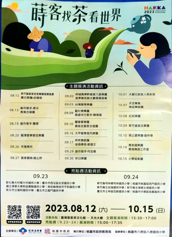 轉知 台灣客家茶文化館「尋客茶路」,展覽館開放時間:每週二至週日09:00~18:00(週一休館)。暨「蒔客找茶看世界」主題展演、亮眼週活動,詳見附件DM。