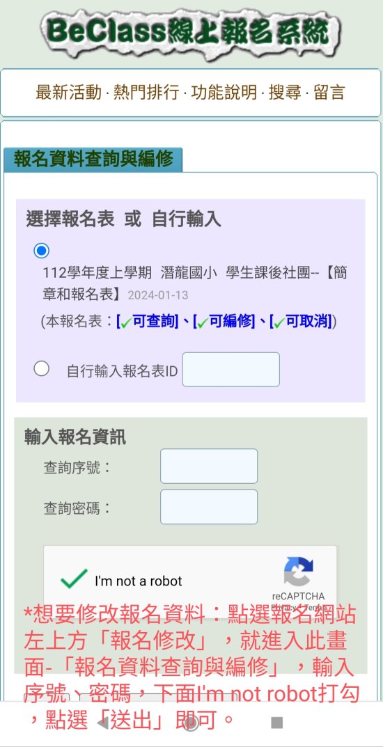 *要修改報名資料,點選報名網站左上方「報名修改」,進入修改畫面,輸入當初報名是email回覆的查詢序號、密碼,I am not robot.打勾,點選送出。