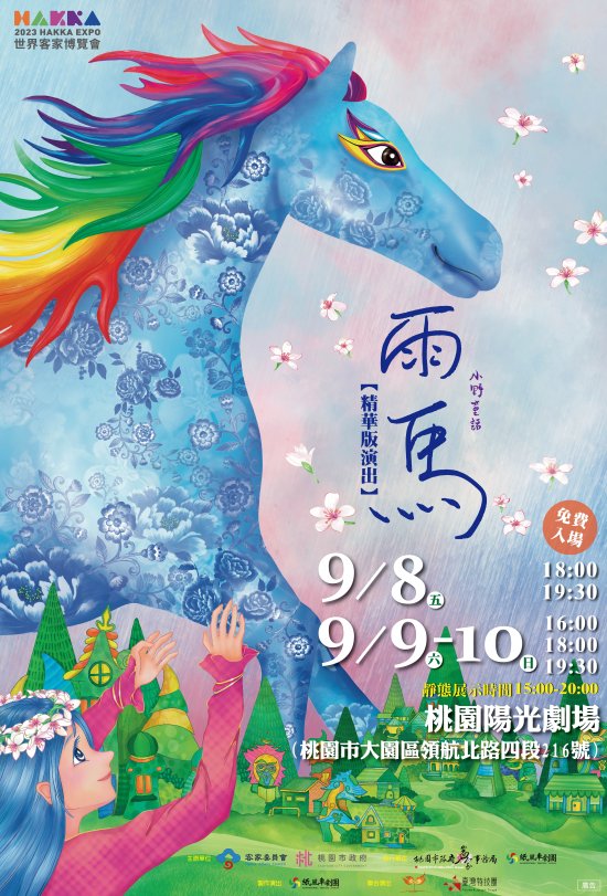 三、配合世界客家博覽會活動,本局於紙風車劇團合作,將於桃園陽光劇場(桃園市大園區領航北路四段216號)辦理《雨馬》演出,演出時間如下: