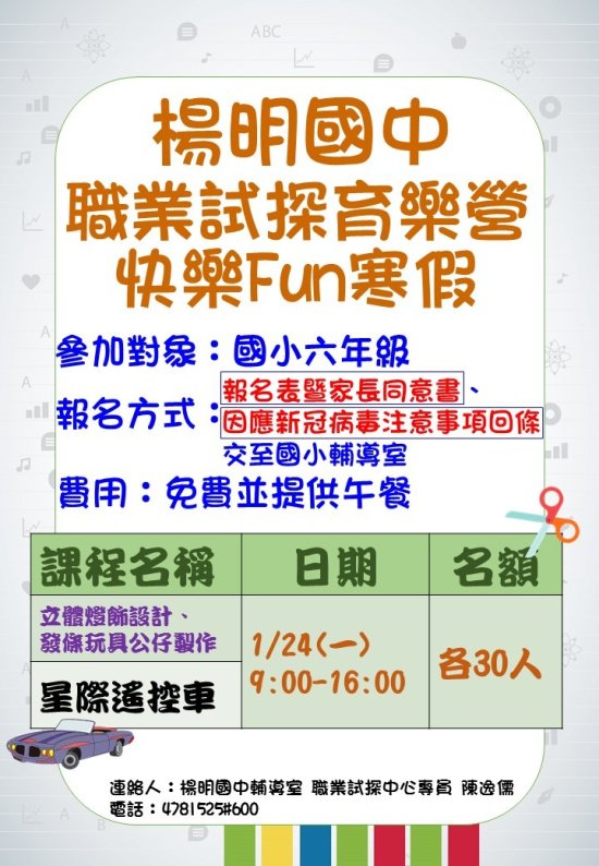 | 五、 | 本課程採全日營隊方式,提供免費午餐,課程內容與學期中體驗課程不同,旨揭計畫、報名表、注意事項回條及宣傳海報如附件。 |
