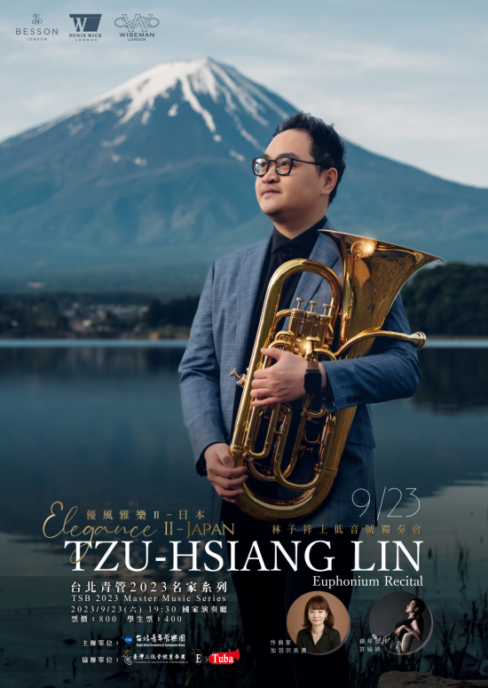一、2023台北青管名家系列,本次規畫邀請台北青管上低音號首席林子祥老師,攜手鋼琴合作名家許毓婷老師,精選多首日本樂曲與委託創作,呈現日式風格華麗炫技與銅管美聲。