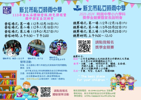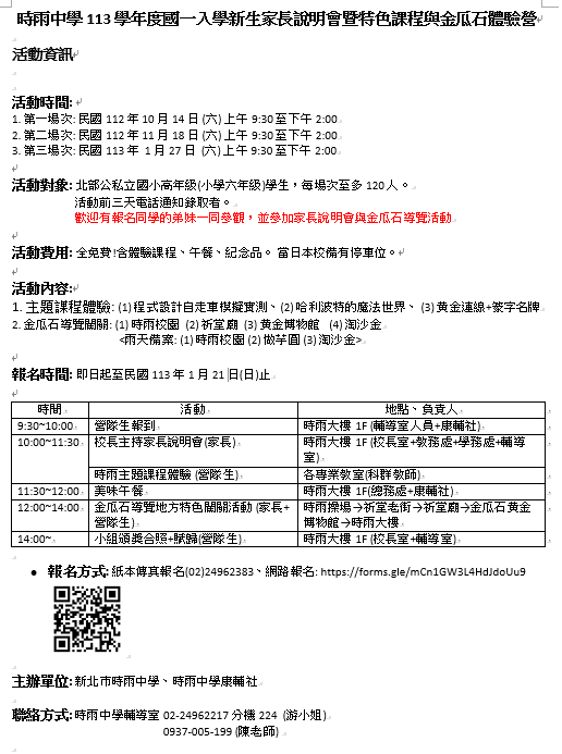 主旨:檢送新北市私立時雨高級中學112學年度第一學期 金瓜石人文暨時雨特色課程體驗營實施計畫與報名海報一份,請惠予公告貴校高年級學生及家長週知,至紉公誼。