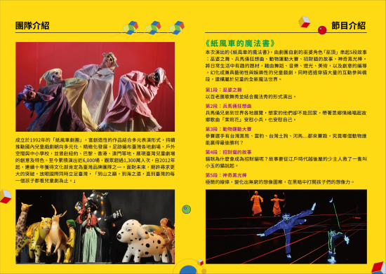 本場次節目《紙風車的魔法書》,由劇團自創的巫婆角色「巫頂」串起5段故事:巫婆之舞、兵馬俑狂想曲、動物運動大賽、招財貓的故事、神奇黑光劇。將日常生活中有趣的題材,藉由舞蹈、音樂、燈光、美術,以及創意的編導,幻化成兼具藝術性與娛樂性的兒童戲劇,同時透過穿插大量的互動參與橋段,建構屬於兒童的全新魔法世界。