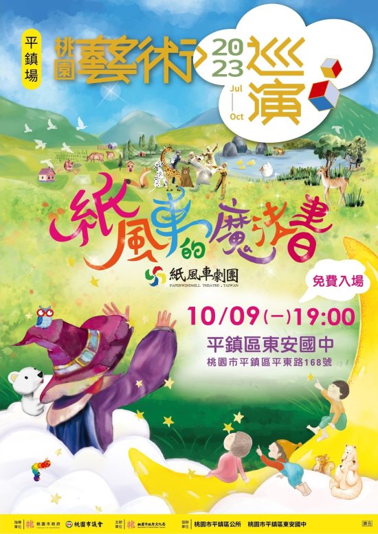 112年10月9日(星期一)晚間7點歡迎來平鎮區東安國中操場欣賞由「紙風車劇團」演出的奇幻兒童劇《紙風車的魔法書》,一同共度充滿歡笑的難忘夜晚!