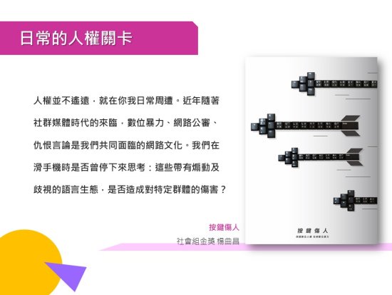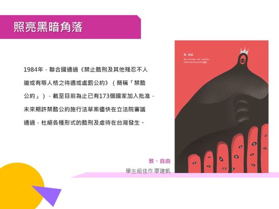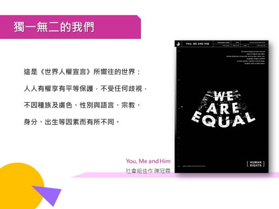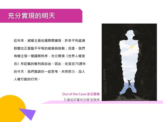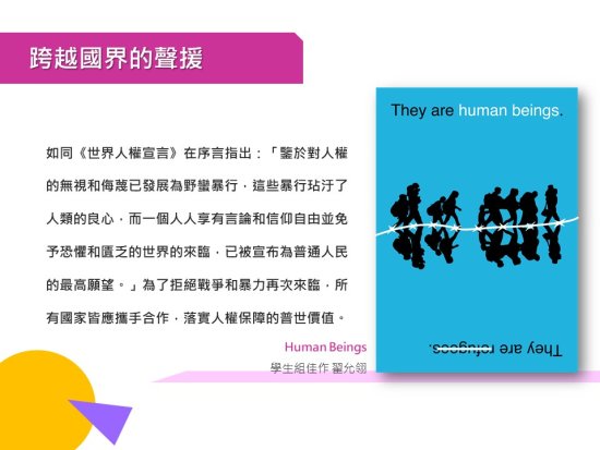 二、今年正值《世界人權宣言》75週年,為落實以人權教育為 本的校園文化,本會以「世界人權宣言75:2023人權海報 特展」為素材,製作人權海報簡報檔及影片檔,期望促進 社會大眾對於人權議題及宣言精神之認識。
