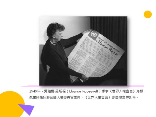 說明: 一、1948年12月10日,聯合國大會在法國巴黎夏樂宮通過《世 界人權宣言》,為維護人類基本權利之保障文獻,第1條開 宗明義寫著:「人人生而自由,在尊嚴和權利上一律平 等。」明確列出無論國籍、性別、膚色或信仰,全體人類 皆應享有這些權利。
