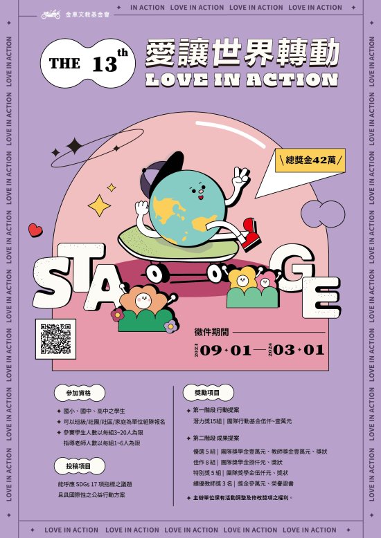 一、本會自2011年開始舉辦「愛讓世界轉動 兒少公益行動」徵選,以STAGE行動步驟為基礎,從發現問題、創意思考、行動實踐到收穫反思,鼓勵青年學子以國際視野落實在地行動,培育下個世代成為具備同理心、行動力及團隊溝通力之世界公民。