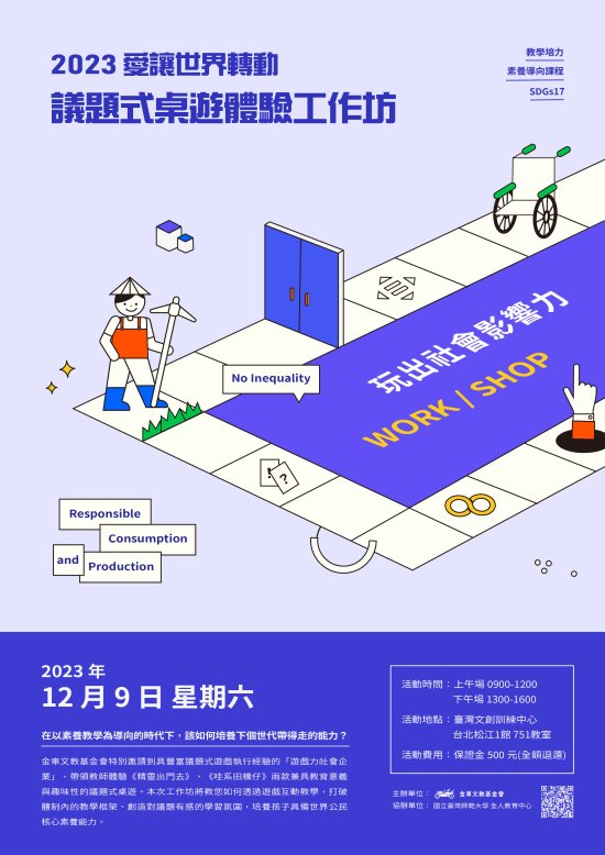 | 一、 | 金車文教基金會長期深耕國際素養教育,定期辦理教師增能課程,本次工作坊特別邀請到「遊戲力社會企業」,從SDG10-消弭國家不平等和SDG12-永續生產與消費主題出發,帶領教師體驗《精靈出門去》、《哇係田橋仔》兩款兼具教育意義與趣味性的議題式桌遊。課程中將分享如何透過遊戲導向式教學,跳脫傳統教學框架,創造對議題有感的學習氛圍,培養孩子具備「問題解決」、「團隊合作」、「行動實踐」的世界公民核心素養能力。 |