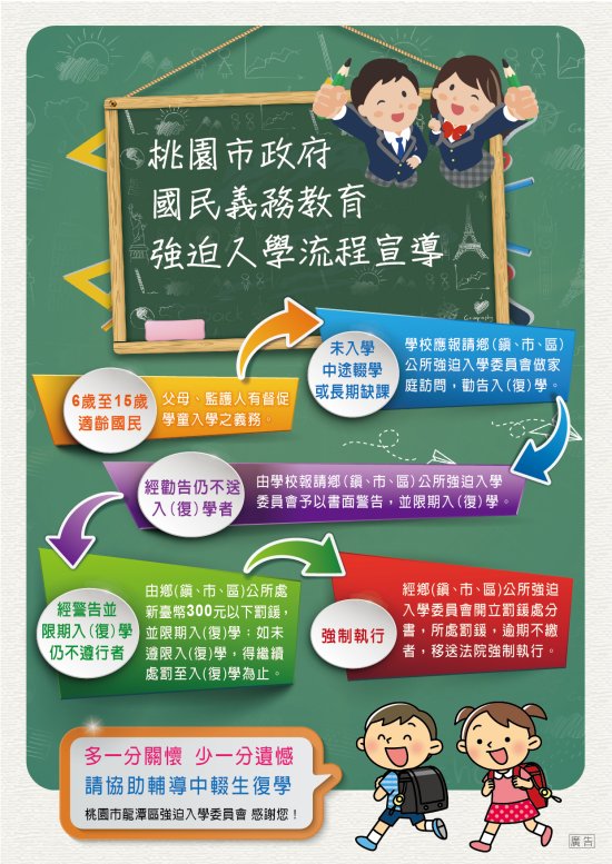 適齡國民接受義務教育宣導: 「多一份關懷,少一 份遺憾,教育『零拒絕』,有愛真不『輟』