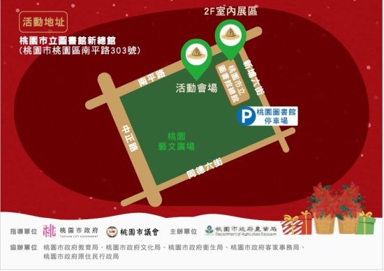 | (二) | 地點:桃園市立圖書館新總館2樓展廳及戶外廣場。 |