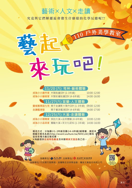 一、本館規畫戶外美學教室「藝起來玩吧!」課程,融合「藝術體驗」、「人文體驗」、「走讀體驗」與在地生活美學連結,為國小學童量身打造藝文美感體驗課程。