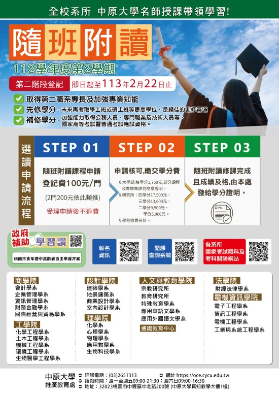 本校全系所全面開放112學年度第2學期隨班附讀,第2階段選讀登記報名自即日起至113年2月22日止。