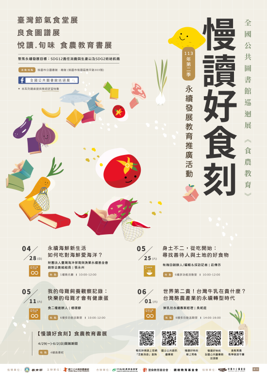 | (三) | 「113年第二季永續發展教育推廣活動」:本次將聚焦永續發展目標:SDG12責任消費與生產以及SDG2終結飢餓,並配合國立公共資訊圖書館主辦之慢讀好食刻主題展,搭配書展推廣食農教育。(活動詳情:https://www.typl.gov.tw/zh-tw/Activity/Content/6304) |