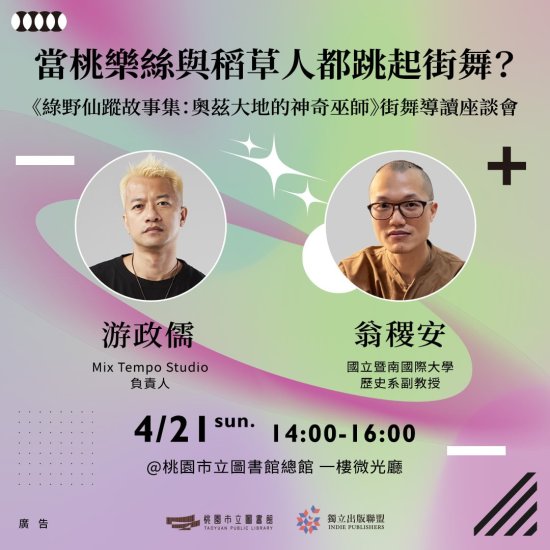 | (二) | 「當桃樂絲與稻草人都跳起街舞?——《綠野仙蹤故事集:奧茲大地的神奇巫師》街舞導讀座談會」:帶動現場大家用身體來閱讀《綠野仙蹤》,帶讀者重新思考閱讀的可能。(活動詳情:https://www.typl.gov.tw/zh-tw/Activity/Content/6295) |