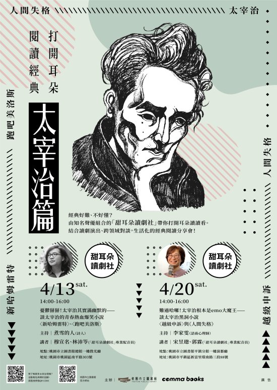 | (一) | 「打開耳朵閱讀經典:太宰治篇!」:以讀劇方式演出,用聽覺感受太宰治筆下人物的極端情感,介紹一代文豪繽紛好笑卻又哀愁無比的多元創作面向。(活動詳情:https://www.typl.gov.tw/zh-tw/Activity/Content/6282) |