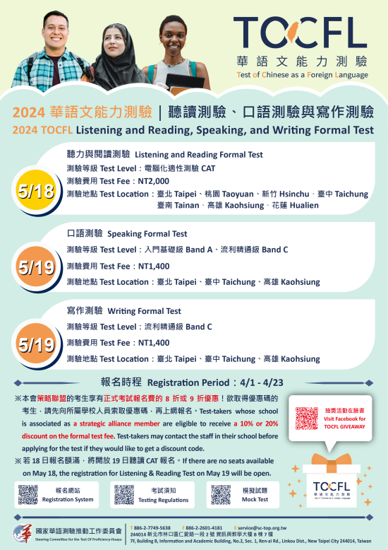 | 七、 | 抽獎活動:凡報考口語或寫作測驗並完成繳費者,可參加華測FB粉絲專頁抽獎活動。詳情請見粉絲專頁貼文:https://www.facebook.com/SCTOP.TOCFL。 |