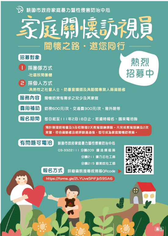 | 四、 | 本府家防中心將於111年2月10日下午2時至3時假本市桃園區縣府路51號8樓(警政大樓禮堂)辦理實體說明會,說明會報名網址:https://forms.gle/bLEwqJywK8gdVD4u8。 |