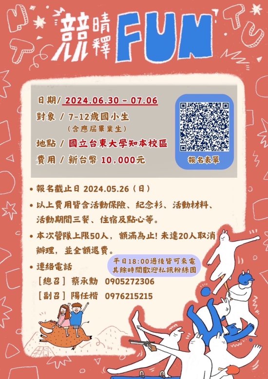 轉知 國立臺東大學運動競技學士學位學程辦理「競晴釋FUN 拼盡全力!選手們的奇幻冒險暑假營隊活動」