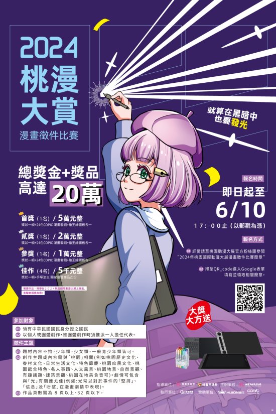 主旨:檢送桃園市政府文化局辦理「2024桃漫大賞:漫畫徵件比賽」活動電子海報1份,請協助宣傳並公告周知,至紉公誼。