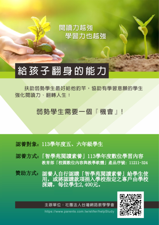 | 二、 | 即日起敬請貴校老師協助學生提報113學年度五、六年級經濟弱勢且有學習意願的弱勢學生,自113年8月1日起就能免費使用「智學苑閱讀素養」,弱勢學生的認定委由學校教師全權認定,請給這些學生一個自我學習的機會。 |
