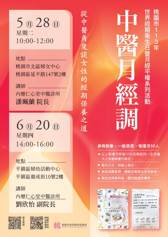 | (一) | 中醫月經調理講座:6月20日(四)下午2點於平鎮區婦幼活動中心,邀請內壢仁心堂中醫診所副院長劉欣怡醫師從中醫角度談女性不同年齡的經期保養之道,以淺顯易懂的圖卡方式,分享女性在生理期前、中、後會出現不同的不適症狀,及各自對應的中醫保健方式。 |